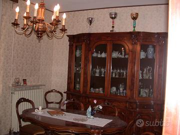Sala da pranzo in legno massello di radica di noce composta da credenza, tavolo e sei sedie imbottite. Gli arredi sono in perfetto stato ed utilizzati pochissimo. Disponibilità alla visione preventiva. Trasporto a carico dell'acquirente. Prezzo poco trattabile.