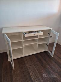 Credenza LIATORP di IKEA in colore bianco, completa di cassetto centrale e ripiani. Elemento d'arredo versatile dallo stile country con forme e dettagli curati. È progettato per essere utilizzato come credenza bassa, buffet o mobile porta TV in soggiorno o sala da pranzo. Misure 145 cm di larghezza, 87-88 cm di altezza e 48-49 cm di profondità. RITIRO SUL POSTO, 3 PIANO.