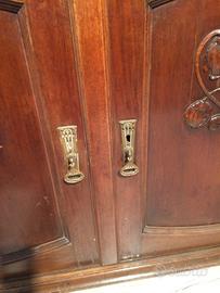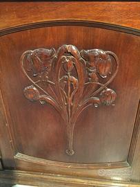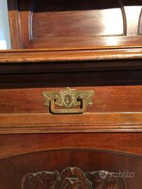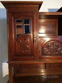 Elegante credenza del primo '900 con intagli floreali Art Nouveau, alzata, ferramenta e vetri originali. Questo articolo antico mostra normali segni del tempo e dell’utilizzo. Ritiro in sede a Padova, possibilità di spedizione da concordare.