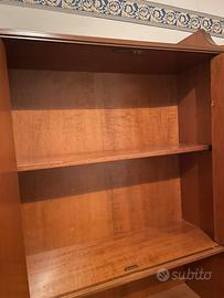 Vendo credenza/libreria in legno, composta da due moduli affiancati. Ogni modulo dispone di ripiani aperti nella parte superiore, perfetti per libri o oggetti decorativi, e di ante chiuse e cassetti nella parte inferiore per maggiore spazio di archiviazione.