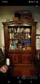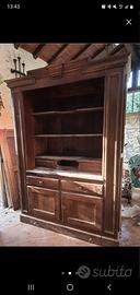 Vendo splendido mobile vintage in legno massello, di grande presenza e fascino. Il mobile è composto da una parte superiore con ampi ripiani a vista, ideale come libreria o per esporre stoviglie e oggetti decorativi, e da una parte inferiore con cassetti e ante, molto capiente e funzionale.