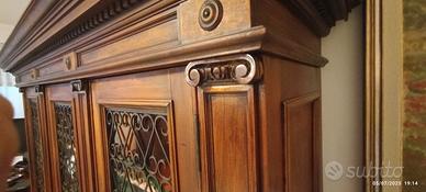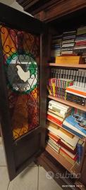 Mobile credenza/libreria in stile classico, in legno massello, con tre ante dotate di vetri colorati dipinti e decorazione in ferro battuto. Ferramenta recente (anni '90). Ampio spazio interno con ripiani, ideale come libreria o vetrina.