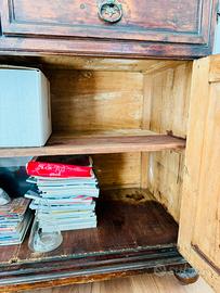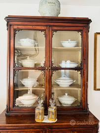 Antica ed elegante credenza di fine ‘800. Parte superiore con vetrina doppia ideale per esposizione; inferiore con due cassetti e due ante spaziosi. Linee classiche, piedi a cipolla, pomelli e maniglie d’epoca. Non necessita di restauro. Divisibile in due parti per comodo trasporto. Mis: prof 57, largh. 120, parte sotto 102, parte sopra 125 e cornicetta 5cm.