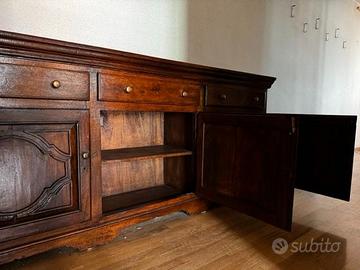 Vendo splendida credenza / cassettiera in legno massello, dal look rustico – adatta a soggiorno, taverna o cucina dallo stile classico in ottimo stato. Il mobile ha una finitura di un bel colore scuro, caldo, con nuance che derivano dal legno (probabilmente rovere o noce), è dotato di tre ante e tre grandi cassetti superiori con una grande capacità contenitiva. Perfetto per chi cerca un pezzo con carattere, non perfettamente “nuovo”, ma che dia atmosfera, capienza e solidità. Misure 210X46X90 Ritiro esclusivamente in loco a carico dell'acquirente.