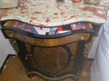 Credenza in stile Napoleone III, copia italiana del famoso ebanista francese Charles Boulle del XIV secolo, in legno laccato nero lucido con intarsi dorati e fregi in ottone, piano in marmo rosa, con cassetto e anta con chiave.