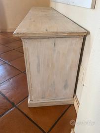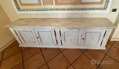 Vendo splendida credenza lunga, ideale per chi ama lo stile provenzale, country chic o shabby chic. La finitura decapata nei toni del bianco e del legno naturale le conferisce un aspetto caldo, vissuto e di tendenza.