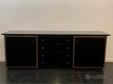 Il mobile è caratterizzato da una struttura in legno laccato nero lucido, una finitura che dona un aspetto sofisticato e moderno. L'intera superficie riflette la luce, creando un effetto scenografico. I dettagli che la rendono unica sono gli inserti in legno (probabilmente noce) che incorniciano le ante laterali, creando un elegante e caldo contrasto con la lacca scura.