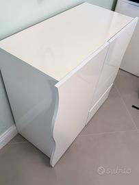 Vendesi mobile contenitore che può essere utilizzata cone madia o credenza in legno laccato di colore bianco lucido, dotata di 1 anta con 4 ripiani interni e 4 cassetti, dimensioni larghezza 87 cm ; profondità 40 cm ; altezza 81 cm.