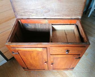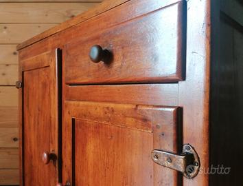Madia credenza, stipo, stile rustico, compatta, anni '30 /'40 in legno di olmo massello con un cassetto e ante a battente con cerniere in ottone tipo Roma e con chiusura a scatto (a pressione con doppia linguetta). Con due ripiani a tutta larghezza. Pianale che si apre a ribalta.