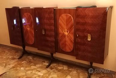 Elegante mobile bar di modernariato italiano, databile agli anni ’50-’60, attribuibile per stile a Vittorio Dassi, celebre designer noto per le linee raffinate e l’uso innovativo del legno. Un pezzo di design mid-century che unisce estetica, funzionalità e artigianalità. Ha 5 ante e un piano in vetro dipinto in marmo e un gioiello nell'anta centrale con specchio. Presenta alcuni segni del tempo ma i mobili di Vittorio Dassi (1893-1973), realizzati negli anni '40 e '50, si distinguono per la scelta dei legni pregiati come il palissandro, il ciliegio, il frassino e il noce, sovente decorati con pannelli intarsiati e cristalli firmati da grandi maestri vetrai. Eleganti nel design senza perdere la qualità funzionale, i suoi arredi sono accostabili allo stile raffinato di Gio Ponti, a cui Vittorio fu legato da importanti collaborazioni dopo essere subentrato al padre nella ditta Dassi Mobili Moderni di Lissone.