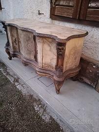 Credenza/comò antico, centennale, in legno massello. linea mossa con piedi curvi e dettagli intagliati. Legno massello su annte e piani. Maniglie in metallo.