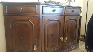 Credenza, mobile buffet, scantonato, 4 cassetti, 4 ante, in legno massello, color noce scuro. Unico difetto piccola scoloritura sul piano. (Foto) Molto capiente. In ottime condizioni. Anni 60. Mobile prodotto in Sicilia secondo lo stile emiliano del 700. Ritiro ad Aprilia. Disponibili ,stesso stile ,comodini e como' con ribalta. Misure: 150X90X40