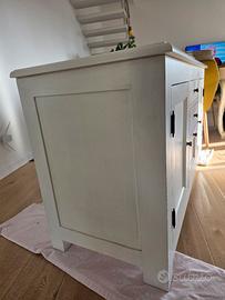 Vendo splendido mobile/credenza versatile, perfetto per arricchire sia il soggiorno che la cucina con un tocco di eleganza rustica e shabby chic. Questo mobile è ideale come buffet, mobile TV/Hi-Fi o per riporre stoviglie e oggetti di casa. Caratteristiche Principali: Design: Stile country/rustico con finitura bianca, leggermente anticata sui bordi per un affascinante effetto shabby chic. Le maniglie a pomello in ottone scuro aggiungono un tocco vintage. Capacità e Organizzazione: Massima funzionalità grazie a: 2 Ante laterali: Ogni vano contiene un ripiano interno (come visibile in foto) per ottimizzare lo spazio. 3 Cassetti centrali: Perfetti per posate, biancheria, o piccoli oggetti. I cassetti inferiori sono dotati di moderne guide in metallo per una scorrevolezza ottimale. Condizioni: Ottime condizioni generali. La pittura e la finitura sono state curate per mantenere l'aspetto originale. Materiale: Legno robusto. Dimensioni (circa): Profondità: 54 cm Larghezza: 135 cm Altezza: 76 cm Prezzo: 450 euro (Leggermente trattabile) Ritiro: A carico dell'acquirente. Contattatemi per qualsiasi domanda o per organizzare una visione del mobile!