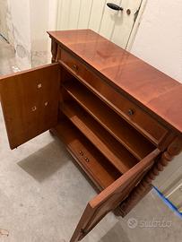 Credenza / Mobile Contenitore --- Stile Classico --- Elegante credenza in legno dal gusto classico, caratterizzata da una struttura solida e da dettagli decorativi lavorati sul frontale e sui lati, che le conferiscono un aspetto importante e raffinato. Perfetta per arredare soggiorno, sala da pranzo, ingresso o taverna, offrendo tanto spazio contenitivo senza rinunciare allo stile. Il mobile è dotato di un cassettone e ante frontali, il vano all’interno è organizzato con 2 ripiani che dividono lo spazio in più scomparti, ideali per riporre piatti, tovaglie, bottiglie, documenti o oggetti vari mantenendo tutto in ordine e ben sistemato. Il piano superiore ampio è perfetto come superficie d’appoggio per TV, lampade, cornici, soprammobili o elementi decorativi. Dimensioni all’incirca: 45 cm x 42 cm Altezza all’incirca: 168 cm Ottime condizioni --- Originale --- Prezzo: 70 € Venduto con formula — VISTO E PIACIUTO —