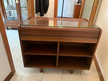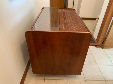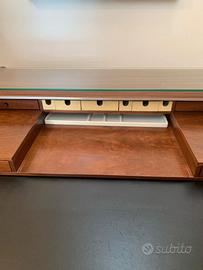 Raro e raffinato scrittoio modello 804, progettato dall'architetto e designer Gianfranco Frattini per la Casa Bernini nei primi anni '60. Questo mobile rappresenta la sintesi perfetta tra raffinata artigianalità del legno e sofisticata meccanica del design: alla vista si presenta come un elegante mobile cassettiera, ma al semplice gesto di estrarre il piano di scrittura, simultaneamente la serranda si apre rivelando un'efficiente postazione di lavoro, con piccoli cassetti e piano rivestito in pelle. La struttura è realizzata in legno di noce, abbinato a elementi metallici e vetro sulla parte superiore come ripiano extra. Grazie al retro finito con ripiani aperti, lo scrittoio piò essere posizionato anche a centro stanza, valorizzando la sua doppia funzionalità. Piccoli segni di usura dovuti all'utilizzo e allo scorrere del tempo. PREZZO TRATTABILE. Costi di spedizione a carico dell'acquirente.