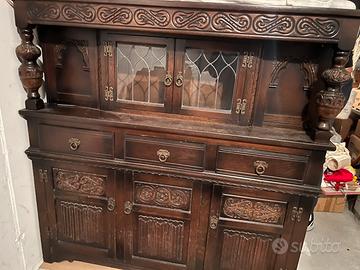 Credenza old London in legno massello . Ci sono 4 porticine , 4 cassetti e due porticine cin i vetri . Se volete altre foto chiedetele pure. Quanche segno dell’ eta’.