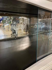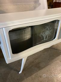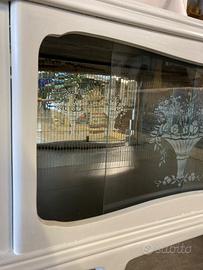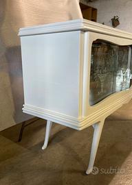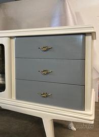 Credenza originale e vintage anni '60. Restaurata, verniciatura a pennello color bianco con tre cassetti color grigio freddo. Vano con antine scorrevoli in vetro originale con dettagli. Interno in mosaico di vetro. Nota che ci sono delle parti originali di vetro e specchio scheggiate e rovinate.
