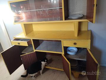 credenza anni 50, misure 50-170-170 cm, separabile in due pezzi per il trasporto. piccole abrasioni sul colore giallo, uno sportelli un po' duro