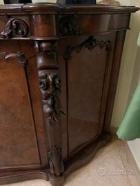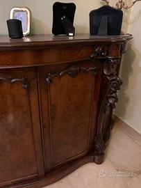 Credenza / madia da sala dei primi del Novecento, realizzata in legno di noce impiallacciato, con un ricco apparato decorativo che richiama il gusto eclettico tardo-ottocentesco con influenze barocche.