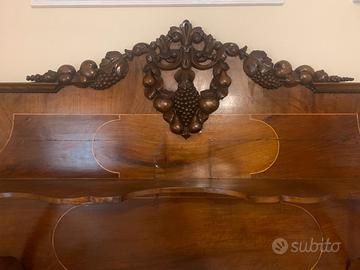 Credenza ,servante, buffet in noce massello. Schienate intarsiato, con decorazioni a tema frutta. Piani in marmo bianco di Carrara. Dimensioni: lunghezza 188 altezza mobile 85, schienale altezza 185. 2 ante e 3 cassetti