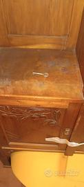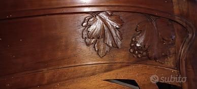 Credenza primi '900, composta da una parte inferiore( con 2 ante laterali e una grande centrale con mensole) e da una parte superiore con due ante laterali ( formate da una nicchia/mensola alta e uno sportello chiuso ciascuna e un' anta centrale in vetro più grande con ripiani interni). Fra le due parti si trovano anche due cassetti. Intarsiata con decorazioni floreali e frutta, vetro disegnato con decorazioni in rilievo.