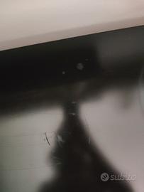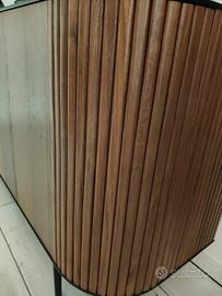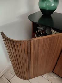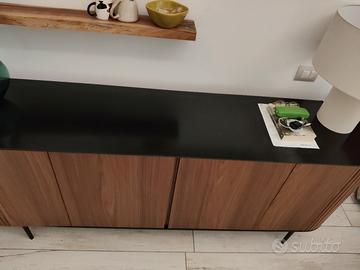 Acquistata 1 anno fa , è in perfetto condizioni,ha solo qualche graffio sul piano nero,dovuto all' appoggio di qualche oggetto d'arredo. È bellissima e capiente,lunga due metri arrotondata negli angoli dove ci sono le ante a scomparsa.Marrone con piano nero.