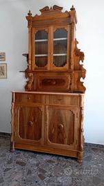 Replica credenza doppio corpo con alzata, stile Luigi Filippo in masso di noce nazionale, con piano in marmo rosato, con delle venature grigie. Presenta 2 ante a vetrina nel corpo superiore arricchito da ricca cimasa e colonnine tornite. Nella parte inferiore ci sono 2 cassetti e di 2 ante chiuse con colonnine intagliate. Il mobile è in ottimo stato