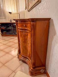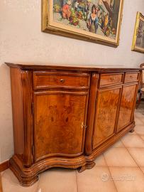 Credenza classica in legno scuro, con intarsi, ante e cassetti. Mobile elegante e capiente, ideale per sala da pranzo o soggiorno.