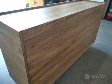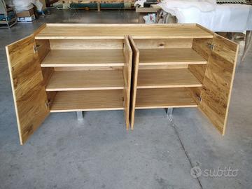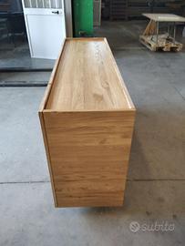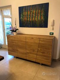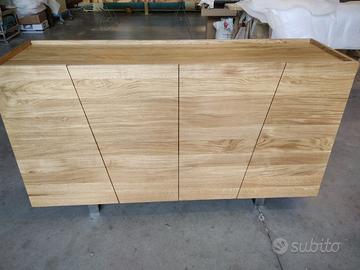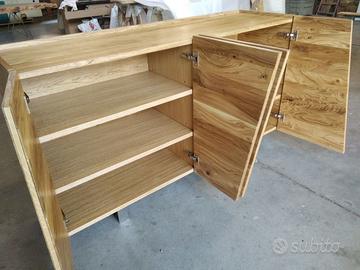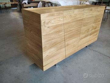 Credenza in rovere massello a 3 strati per dare bilanciatura omogena nel tempo con misure lunghezza 170 prof. 50 h 95 costruita con struttura esterna ante fianchi coperta/piano e schienale a 3 strati con interno in multistrato di pioppo mentre esterno cartelle da circa 6/8 mm di rovere massello 1° qualità esente nodi e spaccature con venatura continuativa, in modo che resti dritto e bilanciato nel tempo. Venature orizzontali sia per ante fianchi piano e schienale. Particolare superiore con sporgenza dei fianchi esterni di circa 1 cm come pure frontalmente per le ante e posteriormente per lo schienale che non cadano oggetti. Internamente listellare ricoperto di rovere tutto spazzolato 2 + 2 ripiani interni aggiustabili con ferramenta idonea per vano (totale 2 vani) senza maniglie perché si apre da sopra, cerniere ammortizzate in chiusura marca grass gambe sottostanti costruite dal ns fabbro in acciaio inox spazzolato con misure idonea e proporzionata con h 12 cm circa, seguirà disegno in caso di accordo, filtrini per appoggio a terra. Il tutto unito come pure lo schienale con barilotti perni in ferro con grano e spine in legno con giunzioni lamello invisibile spazzolato con finitura oliata trasparente. compreso di imballo franco fabbrica non comprendente di iva. il mobile è già stato prodotto su specifiche del cliente su commissione di conseguenza non è in pronta consegna e non teniamo a magazzino ma essendo i diretti produttori costruiamo solo su misura in base alle proprie esigenze, per dubbi e chiarimenti contattateci. direttamente dal produttore falegname costruiamo su misura a piacere del cliente. ASTENERSI RIVENDITORI E COMMERCIANTI