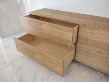 credenza costruita in listellare ricoperto di rovere rustico con qualche crepo e spaccatura stuccato con stucco nero con misure lunghezza 220 prof. 50 h 90 comprese gambe costruita con struttura esterna ante fianchi coperta e piano in listellare spessore 25 mm mentre lo schienale posteriore da 8 mm, coperta unita dritta ai fianchi composta parte dx con 2 ante interno ripiano aggiustabile in altezza tramite ferramenta adatta, si apriranno su cerniere ammortizzate in chiusura e apertura tramite fresata superiore a 45° e poi verrà bordato il tutto, lato sx composto da 2 cassetti da circa 100 circa posti uno sopra altro su guide ammortizzate in chiusura interno cassetto in betulla sponde da 16 e fondo da 8 mm e si apriranno su gola e il cassetto sotto nella parte centrale. Piedini in acciaio inox costruito a C misura circa 2,5 x 2,5 che verranno avvitati parte sotto della credenza h circa 15 circa, e saranno 3 in quanto la misura della credenza scarichi il peso centrale e laterale. finitura oliata trasparente, Compreso finitura Iva non comprendente, costruito su commissione, non disponibile a magazzino ma possiamo riprodurlo DIRETTAMENTE DAL PRODUTTORE ASTENERSI RIVENDITORI O COMMERCIANTI