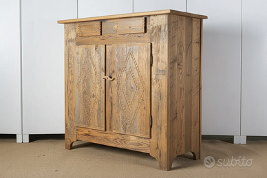 Credenza rustica in legno massello con finitura naturale, caratterizzata da due ante frontali decorate con motivo geometrico intagliato che valorizza lo stile artigianale del mobile. La struttura solida e le venature del legno ben visibili conferiscono un aspetto caldo e autentico, ideale per ambienti in stile country, montano o rustico. All’interno offre uno spazio capiente per stoviglie, biancheria o oggetti vari, rendendola perfetta per cucina, taverna, soggiorno o casa di montagna, unendo praticità e forte carattere estetico.