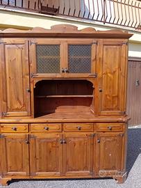 Credenza rustica in legno, 6 sportelli, 4 cassetti. Vetrina lavorata.