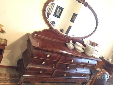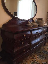 Credenza sala in legno massello con frontale ondulato in ottimo stato. Tre cassetti centrali e due scomparti laterali. Lunghezza 194 cm, profondità 60 cm, altezza da terra a piano d'appoggio 97 cm. Disponibile con o senza specchio. Il prezzo indicato si riferisce alla sola credenza. Prezzo trattabile. Modalità di consegna da concordare.