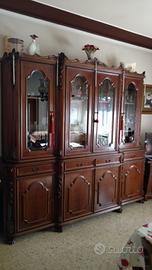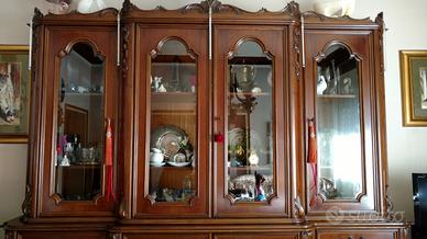 Credenza in Noce patinato, composta dalla Credenza - base 4 ante: cm 255x98x56 con 4 cassetti e 4 ante su 3 scomparti interni suddivisi all'interno da 1 ripiano, e la Vetrina con 4 ante (con vetro) cm 240x140x50, su 3 scomparti interni suddivisi all'interno da 2 mensole ciascuno.