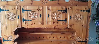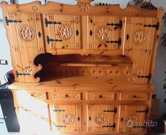 Credenza stile tirolese , color miele in legno massello, disegni intagliati come visti nelle foto, cerniere a vista color nero, tenuta molto bene. Ritiro a carico dell'acquirente ,scrivere per info delle misure . No perditempo. Vendo € 600 leggermente trattabili.