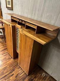 Credenza "Scaligera", disegnata da Franco Poli per Bernini negli anni ’80, rappresenta un raffinato esempio di design italiano e maestria artigianale. Realizzata in noce nazionale e vetro. La struttura comprende due sportelli laterali con cassetti e mensole, mentre l’anta centrale, caratterizzata da un elegante inserto in vetro, offre un’ulteriore organizzazione con mensole interne. La parte superiore della credenza presenta vani aperti e due cassetti, perfetti per l’esposizione o il contenimento discreto di oggetti. Il basamento reca il marchio a fuoco del produttore, ulteriore attestazione dell’autenticità e della qualità dell’opera. Le dimensioni sono cm 138,5x162x45, e la credenza è in ottimo stato, conservando intatta la sua bellezza e il suo valore.