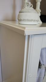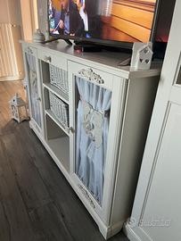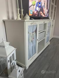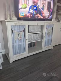📝 Descrizione: Vendo splendido mobile porta TV in stile shabby chic, colore bianco con raffinati dettagli decorativi. Dotato di due ante laterali con tendine decorative (facilmente removibili), ripiani centrali e pratiche ceste in vimini incluse, perfette per organizzare oggetti, telecomandi o accessori. Il mobile è ideale per arredare soggiorno o camera da letto con un tocco elegante e romantico. Condizioni ottime, ben tenuto. 📏 Struttura solida e capiente 🧺 Ceste incluse ❗ Tendine NON incluse (come da annuncio) Ritiro a mano. Misure : lunghezza 145 Profondità 49 Altezza 88