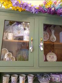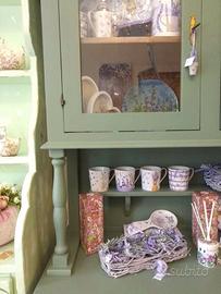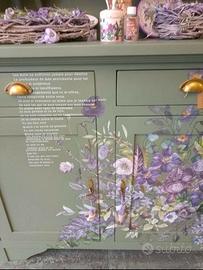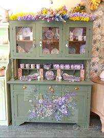 credenza legno massiccio rivisitata in chiave shabby chic colore verde arricchita da decori floreali ...interno noce pezzo unico nel suo genere! dopo il restyling esposta in negozio per visionarla dal vivo potete venire presso il nostro Store la bottega di Aurice via Alcide de Gasperi 74A Monteroni di Lecce