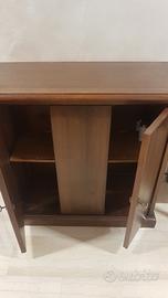 Credenza in legno con 2 ante apribili con serratura con chiave e anta centrale fissa. Un ripiano interno, capiente. H 85 P 37 L90.