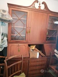 Credenza in stile inglese, 4 cassetti, 2 vetrine libreria e 2 ribaltine segretarie. Tavolo tondo allungabile e 5 sedie. Legno massello, tutto in buone condizioni (no tarli).