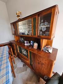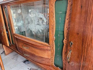 Credenza con alzata – stile Liberty/vintage anni '50 – legno noce Splendida credenza con alzata in legno di noce, stile Liberty italiano, presumibilmente anni '50-'60. Pezzo d'epoca con dettagli artigianali di pregio: Vetri incisi a mano con motivi floreali (fiori e foglie) Pannelli laterali in vetro verde con decori dipinti a mano in rosso/rosa Intagli in legno sulle cornici con motivi naturalistici Maniglie in ottone originali d'epoca Cassetti con profilo sagomato (bombé) Struttura in due pezzi: alzata superiore + credenza inferiore Fondo interno con specchi a griglia che amplificano la luce Condizioni: buone per l'età, segni del tempo compatibili con il periodo. Ritiro a carico dell'acquirente. Non spedibile. Dimensioni: 200 cm larghezza x 175 cm altezza