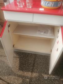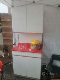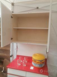 Vendo bellissimo set da cucina in ottimo stato di conservazione, composto da credenza (alt 2,03 m larg. 83 cm) tavolo (lung 130 cm larg 70 alt 81) e 4 sedie rivestite in sky. Colore biancoe rosso con cromature a vista in ottimo stato e zoccolo credenza in alluminio. Ripiani interni, nessun grosso difetto se non normali segni di uso.
