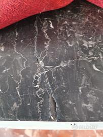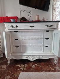 Credenza in stile Luigi XV ridipinta di bianco con marmo nero nella parte superiore separato da una crepa.