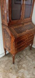 Parte inferiore: Due cassetti in legno riccamente intarsiati ideali per organizzare accessori o articoli da scrivania, e una ribalta a scrittoio, decorata con intarsi fini e precisi, che si apre per rivelare vani porta-documenti.