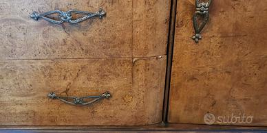Credenza in radica 2 ante curve e tre ampi cassetti, con piano in decoupage protetto da vetro. Misure cm. 164 x 58 H. 91