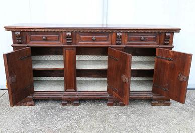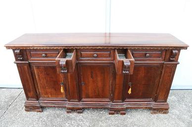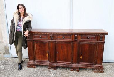 Databile al finire del XIX secolo, questa imponente credenza è stata realizzata interamente in legno di noce massello antico.