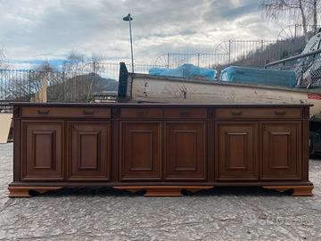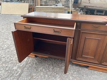 Credenza stile anni 60/70 molto capiente con 3 cassetti e 6 ante con ripiani intenri Lunghezza 280 cm Profondità 50 cm Altezza 88 cm Leggermente danneggiato su un fianco