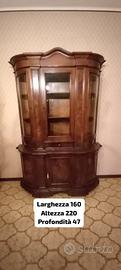 Mobile a due corpi composto da base con ante piene e alzata con ante vetrate, realizzato in legno massello e impiallacciatura in noce, con eleganti fianchi bombati e cornici sagomate.