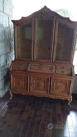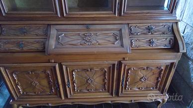 Vendo elegante credenza con vetrina in stile classico, realizzata in legno, con finiture intagliate e linee sinuose. La parte superiore è composta da tre ante a vetro con ripiani interni, ideale per esporre piatti, bicchieri o oggetti decorativi. La parte inferiore dispone di tre ante e cassetti centrali, molto capiente e funzionale. Mobile solido e di grande presenza scenica, perfetto per soggiorno, sala da pranzo o ambiente classico. Condizioni buone, normali segni del tempo che ne valorizzano il carattere. 🔸 Stile classico / Luigi XV 🔸 Legno lavorato con dettagli intagliati 🔸 Vetrina + credenza 🔸 Mobile elegante e di qualità 👉 Ritiro a carico dell’acquirente.