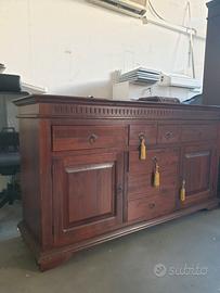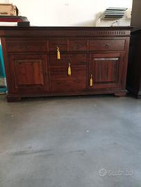 - MOBILE BASSO abbinato, realizzato in legno massello con una finitura scura che ne esalta le venature naturali. stile classico, caratterizzato da linee robuste, colori caldi e un design funzionale. 4 cassetti superiori 3 inferiori e due ante. Il mobile presenta maniglie e pomelli in ottone, alcuni dei quali decorati con nappe gialle (visibili nell'immagine), tipici elementi decorativi che aggiungono un tocco di eleganza esotica. È un mobile contenitore versatile, ideale per soggiorni o sale da pranzo, utilizzabile per riporre stoviglie, biancheria o altri oggetti, fungendo anche da superficie d'appoggio. Lungo 171 cm Profondo 50 cm Alto 94,5 cm